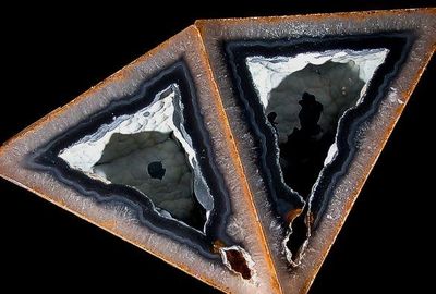 These unusual, eye-catching and unique specimens were mined in 1974 by Odwaldo Monteiro, and to the best of my knowledge, they have never been found again in Paraíba. They are well-known to Agate enthusiasts, but many mineral collectos are not aware that they exist. The most interesting aspect of these specimens is that they have strange geometric forms on the exterior which are completely filled with banded multicolor Agate. These forms are completely natural, and since they do not resemble any recognizable crystal form (most of them are quite different in shape), it is safe to assume that these are not casts or pseudomorphs. There are dozens of theories out there on how these specimens came into being, but nobody can agree, and it's essentially a guessing game for now. What's significant about this specimen is that it is not only colorful featuring bands of midnight blue, lavender, smoky and even golden Agate, but it's actually completely in tact.