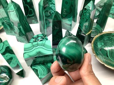 Malachite is considered a rare gemstone in that the original deposits for the stones have been depleted leaving behind very few sources. The use of Malachite as gemstones and sculptural materials remains just as popular today as they were throughout history. It's quite common to cut the stone into beads or cabochons for jewelry. The fact that Malachite has such a rich color and one that doesn't fade with time or when exposed to light makes it particularly rare. The pictures shown are from the Demographic Republic of the Congo.