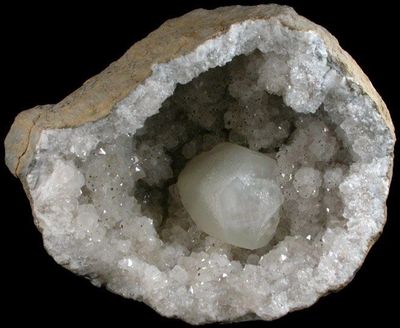 Most Iowa geodes are roughly spherical, often lumpy or cauliflower-like on the exterior, with diameters typically ranging from about two to six inches. However, specimens measuring up to 30 inches are known. The most prized geodes have hollow interiors, although many geodes are solid objects in which crystal growth has filled most or all of the interior volume. Geodes from the Keokuk area contain a variety of minerals, but quartz is dominant in most. Calcite is also a common and attractive mineral in many geodes, which occurs in a variety of crystal habits and colors. An additional 17 minerals have been identified in Keokuk geodes.
